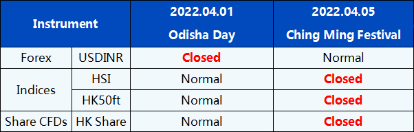 Please be advised that the trading hours and market session times of the following instruments will be affected by the upcoming Odisha Day and Ching Ming Festival.