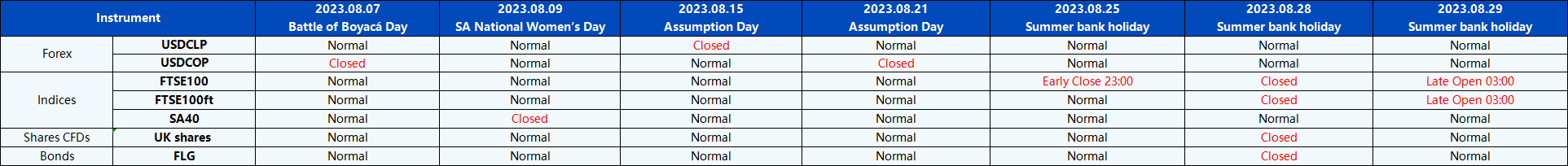 Please be advised that the following instruments’ trading hours and market session times will be affected by the upcoming August holidays.